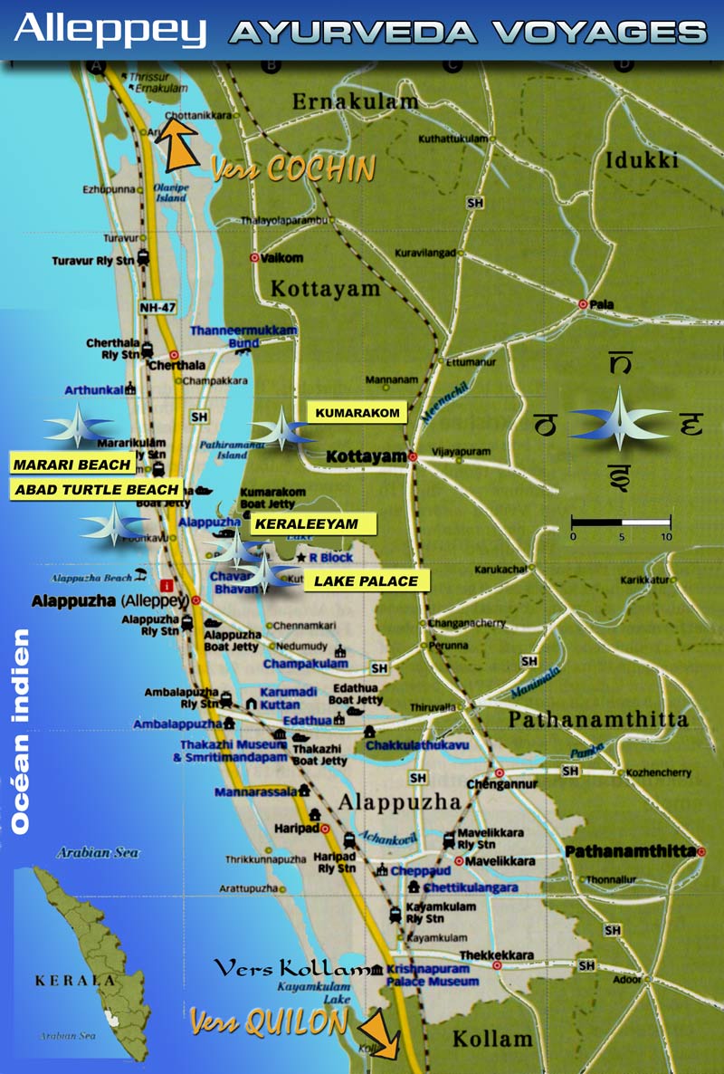 ALLEPPEY is located at the extreme south-west of the large lake VEMBANAD, wedged between the Arabian Sea and the lake on a strip of land just 4 km wide. The whole region is an ocean of greenery, the rice fields are surprisingly below the level of the canals, because the Dutch passed by there (XVIIth century) and imported the technique of the polders there. Access By plane, the COCHIN airport is 90km away, the TRIVANDRUM airport is 3 hours away. Train Alleppey Railway Station is connected to most major cities in Kerala and is directly connected to Ernakulam (Cochin). Road A big road that crosses all Kerala goes through Allepey, the national NH47. The city is well served by coaches. Allepey - Cochin = 2 hours Allepey - Trivandrum = 3 hours To visit Ambalappuzha Sree Krishna Temple. Krishna (Vishnu's 8th avatar) is here revered mainly in his baby form. The ten avatars of Vishnu devour the heart of chuttambalam (circumambulatory). The festival of April attracts thousands of faithful who gather for a big party. The Pallipana ritual, which takes place every 12 years, allows you to attend demonstrations of magic ... white. The temple is also known for the many offerings to Krishna of palpayasam (milk and rice cake) Krishnapuram Palace Museum This palace was built under the reign of Maharaja Marthanda Varma. It is a smaller replica of the beautiful palace of Padmanabhapuram, south of Trivandrum.