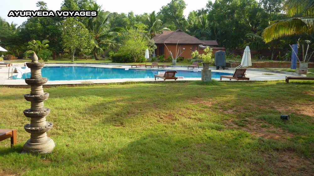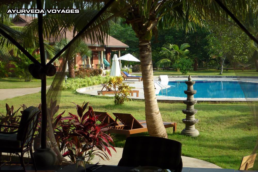 The restaurant reserved for Ayurvedic guests by the private pool is charming, meals are established on the instructions of the vaidyas.