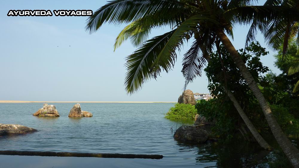 The Poovar Island Resort is on the lake, but the Ayurvedic part is set back, so a good 5 minute walk from the pier, crossing the resort gardens.